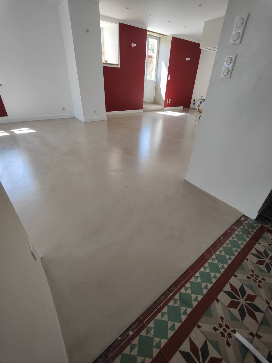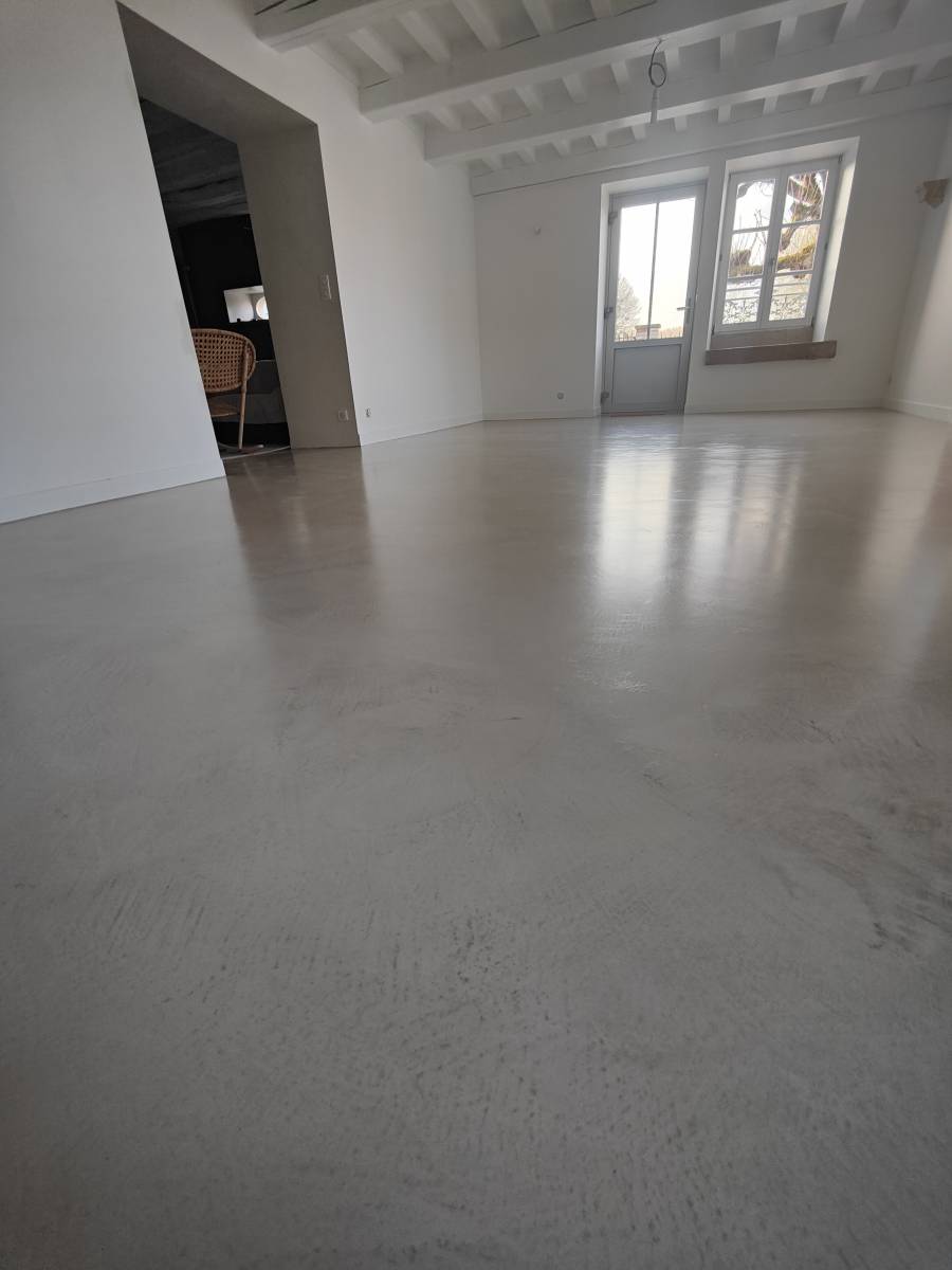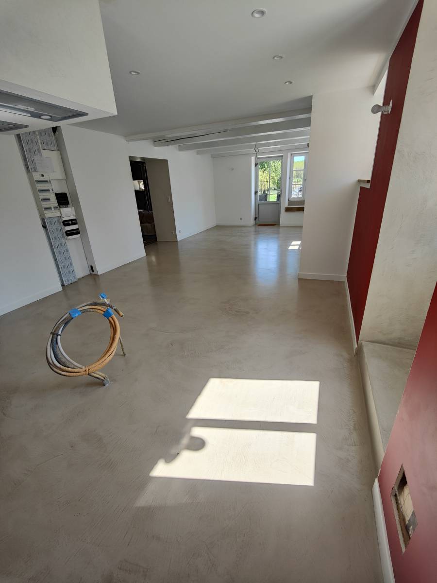 Notre intervention a porté sur la réalisation d'un sol de cuisine et de salle à manger en béton ciré sur une chape ciment à Bresilley en Haute Saône.