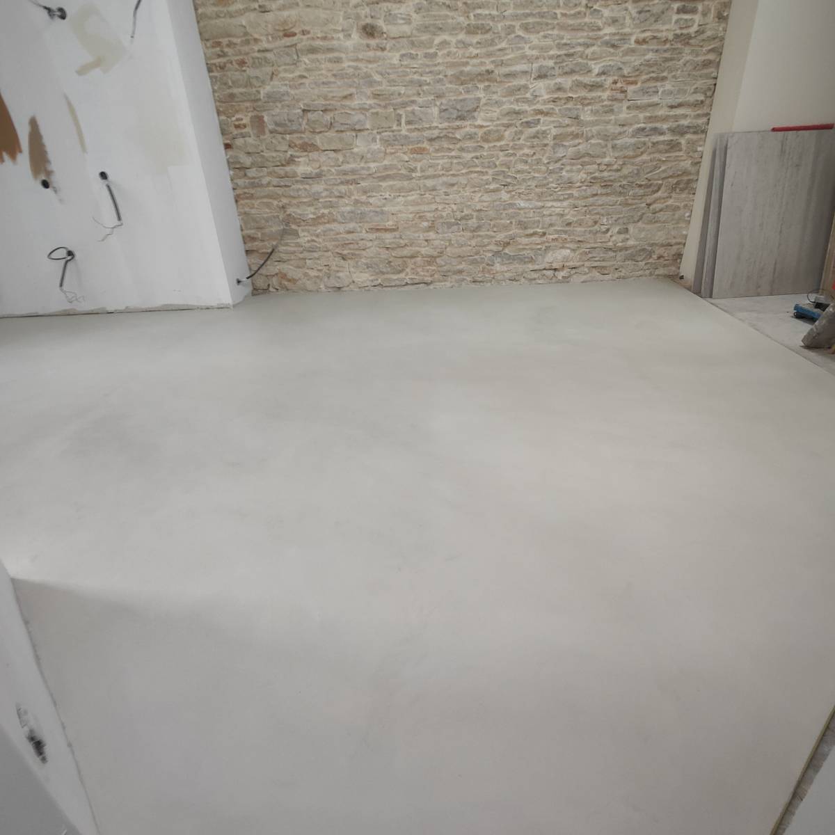Dans ce cas précis, le sol de l'appartement était en panneaux OSB, un support qui demande une attention particulière avant d'y appliquer du béton ciré.