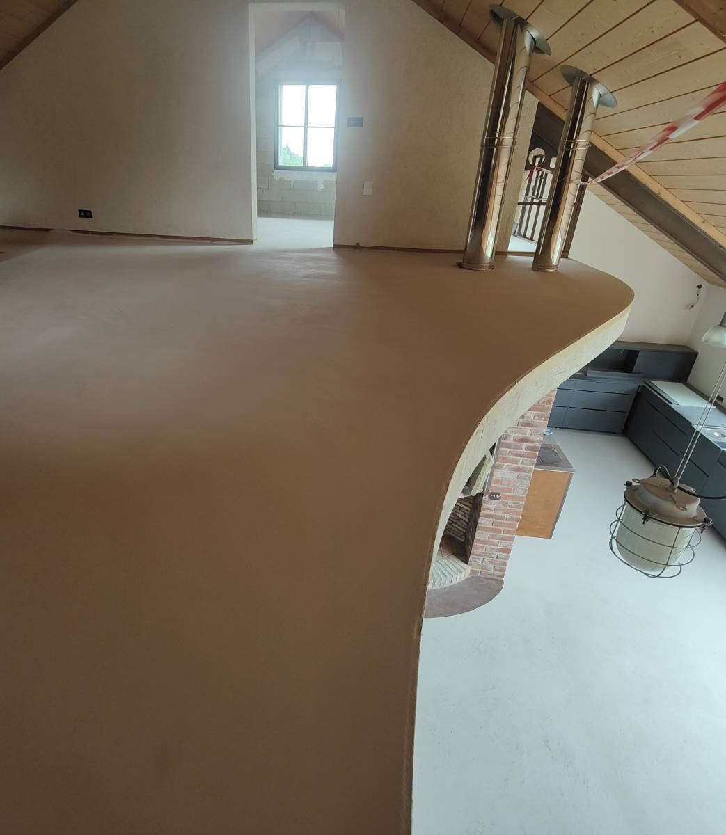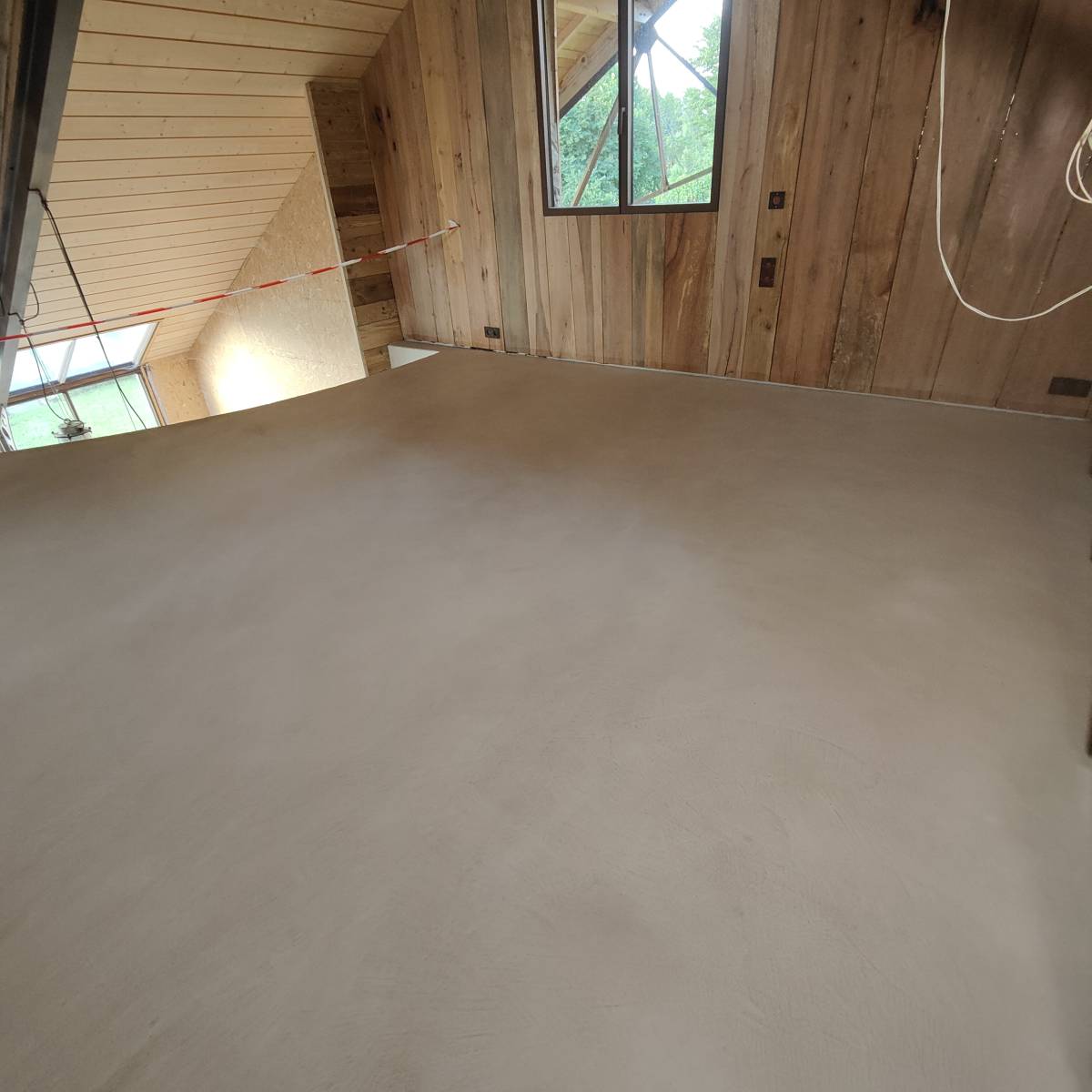 Dans le cadre d’un projet de rénovation, nous sommes intervenus à Tarcenay, près de Besançon dans le Doubs, pour appliquer un revêtement de sol en béton ciré taloché dans une cuisine, salle à manger et une mezzanine, sur un support en chape ciment.