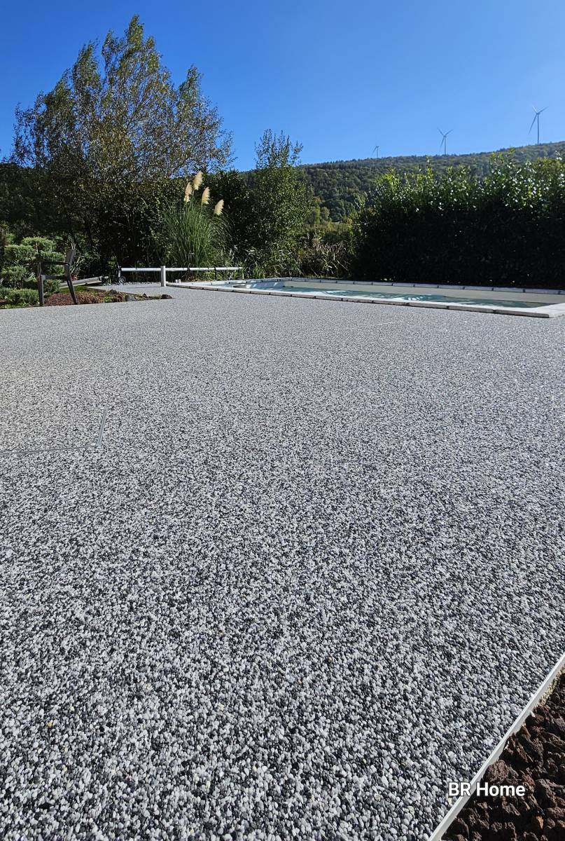 Lors de l’application, le revêtement est taloché avec un platoir semi-rigide, ce qui permet aux granulats de s’imbriquer de manière homogène. Cette finition crée une surface régulière et douce, sans effet abrasif, contrairement à certains carrelages extérieurs structurés.