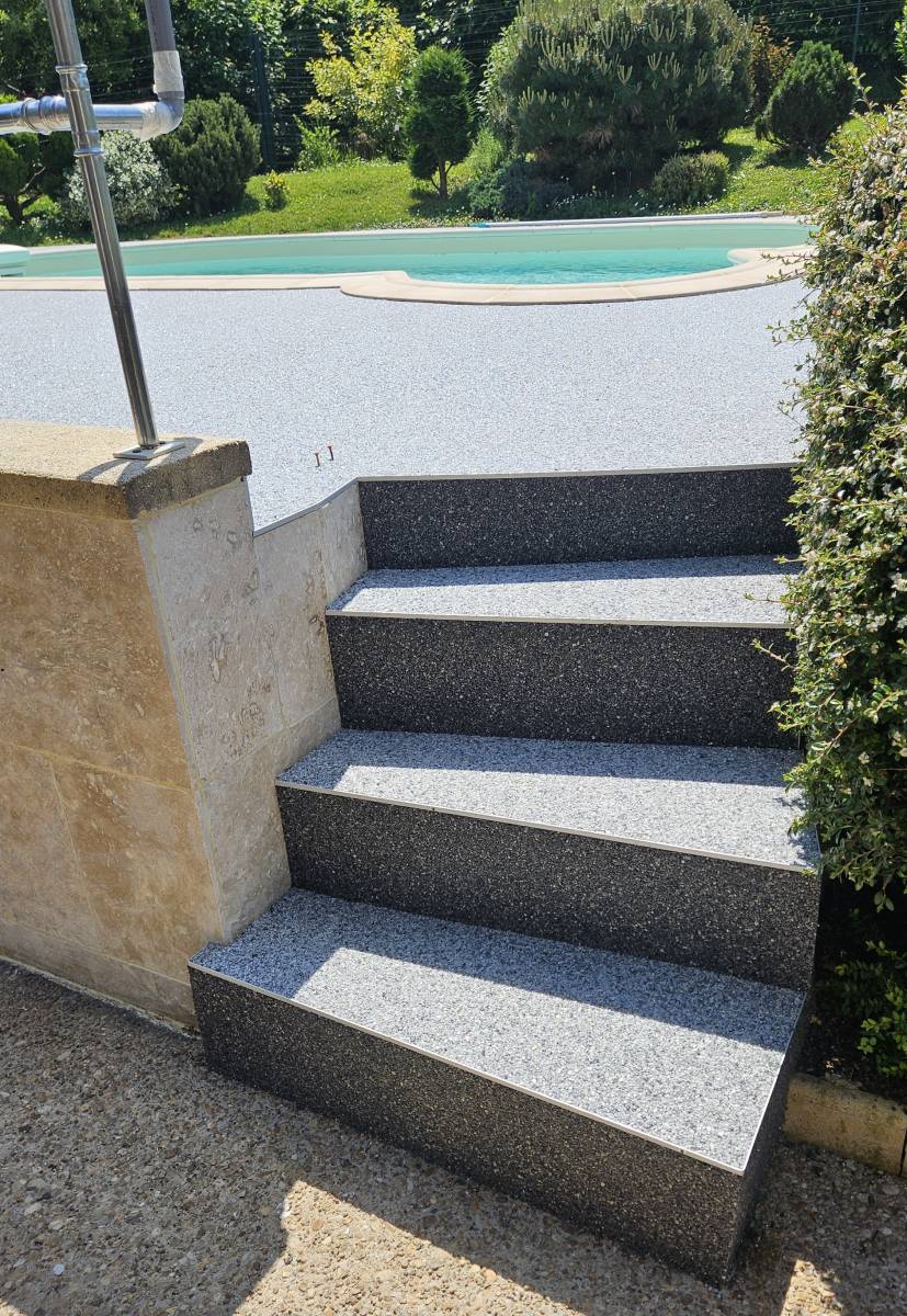 Ce projet concernait l’aménagement complet des abords d’une piscine, incluant la plage ainsi qu’un escalier extérieur avec marches et contremarches.