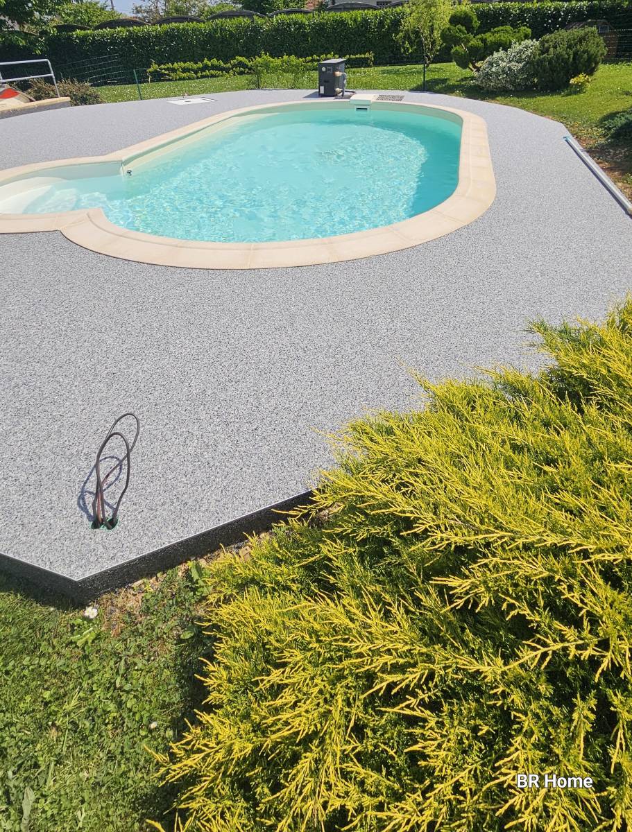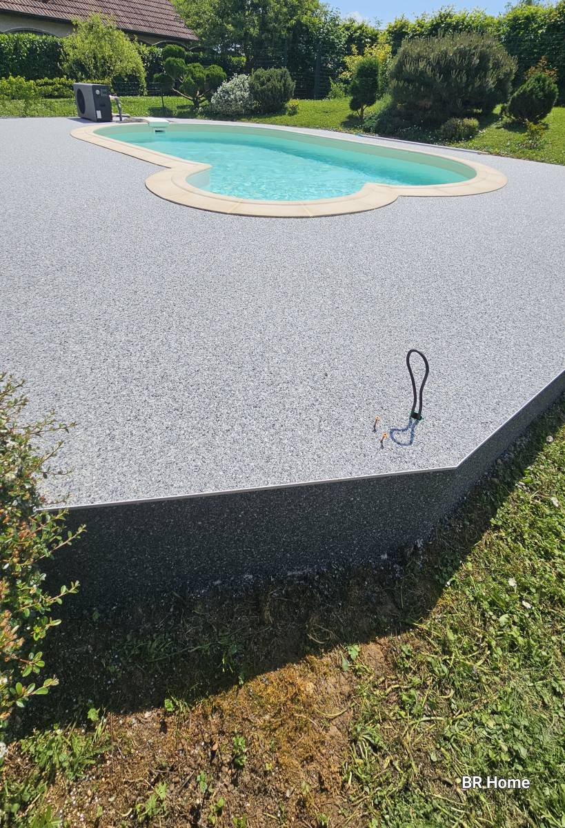 Cette configuration a permis la mise en œuvre d’un revêtement de sol drainant, pleinement adapté à un environnement piscine, sans modification lourde du support existant.