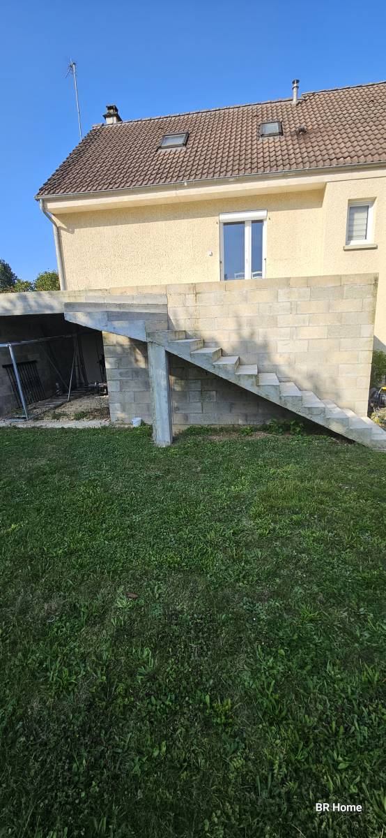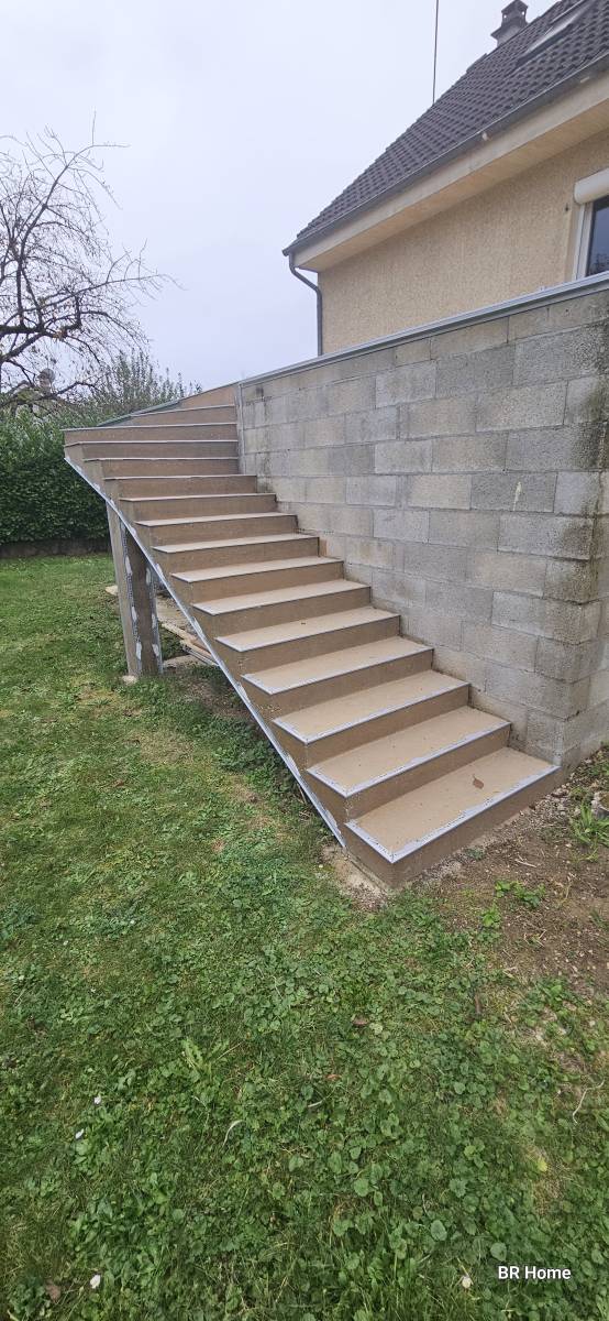 Nous sommes intervenus à Couternon, près de Dijon, pour la réalisation d’un revêtement en moquette de pierre sur un escalier extérieur en béton brut, menant à une terrasse.