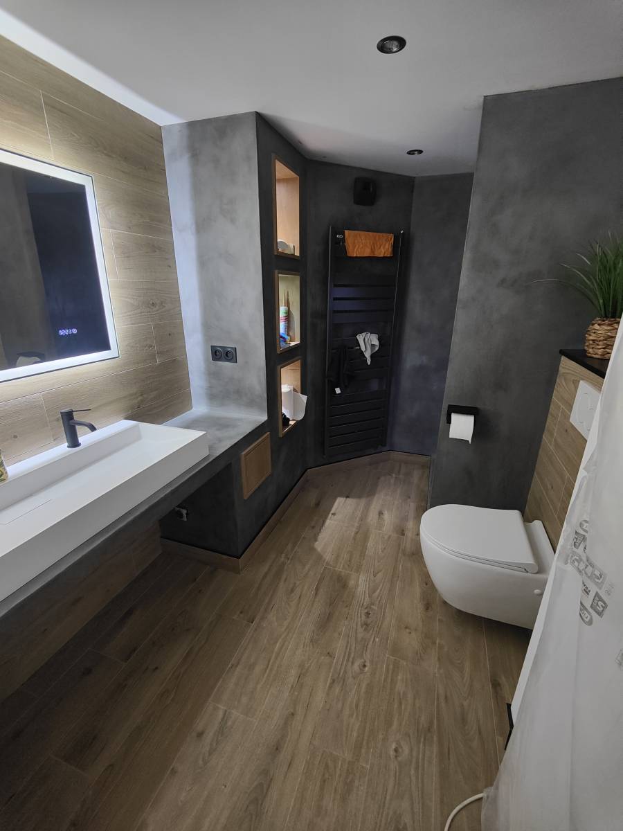 L'effet marbré avec le béton ciré apporte à la salle d'eau une touche unique et raffinée. Ce jeu subtil de nuances, de lumière et de texture crée une ambiance élégante et naturelle, tout en restant facile à nettoyer.