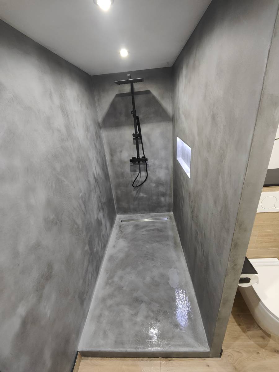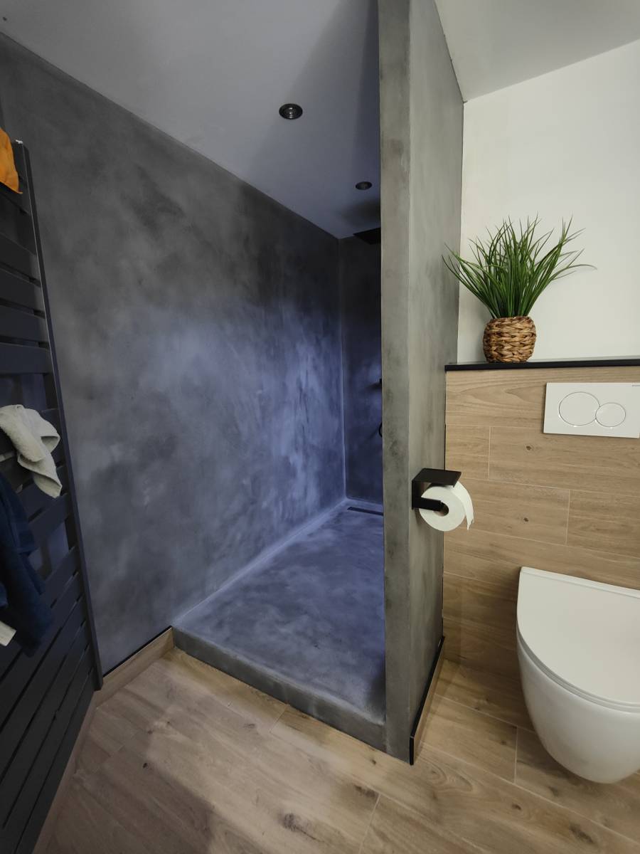 Pour ce projet, une résine d'étanchéité bi-composante à été mis en œuvre sur l'ensemble du receveur et des parois à traité. Ce système assure non seulement la pérennité du revêtement de finition en béton ciré, mais protège également les éléments structurels de l'habitation contre l'humidité et les infiltrations.